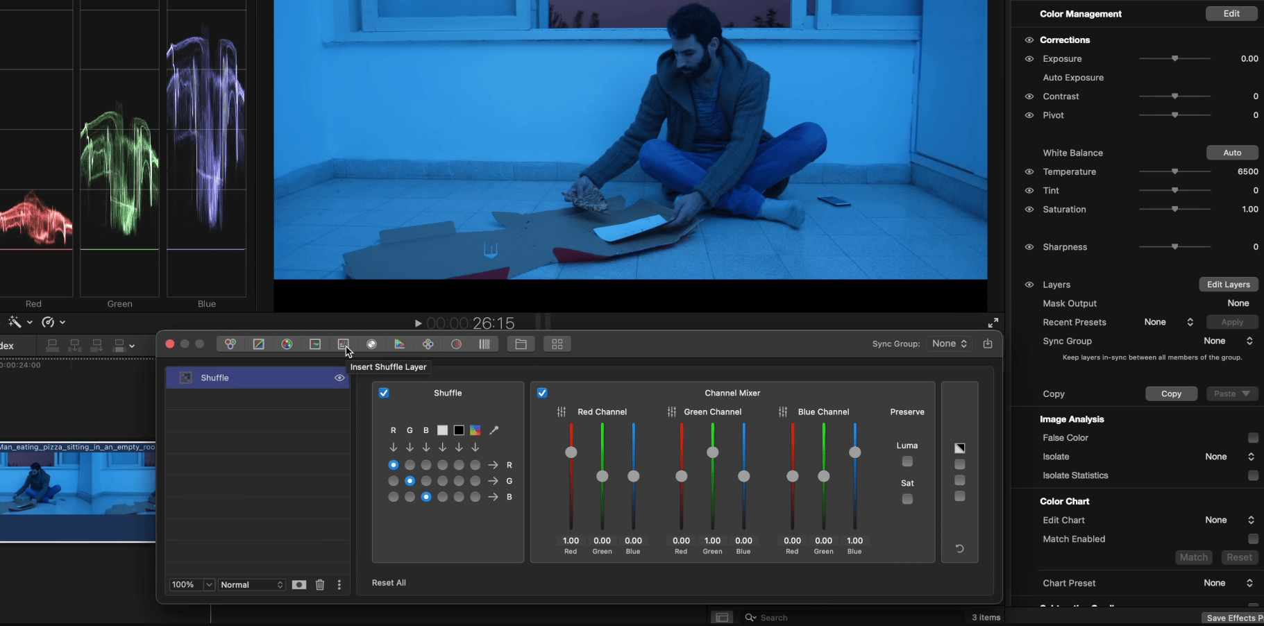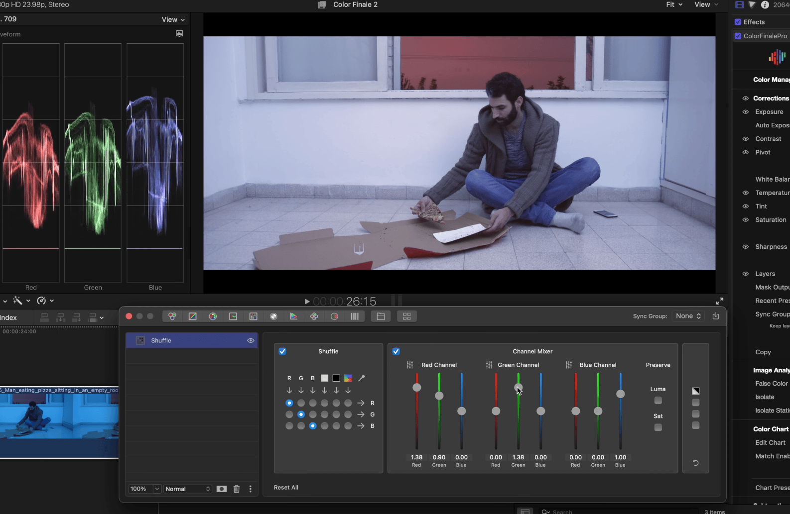 Here, we’ll use only the Channel Mixer. The principle is similar to sliders, but instead of working with shadows, midtones, and highlights, you’re adjusting the amounts of red, green, and blue within each individual channel. Again, guided by the waveform monitor, we start balancing the image. We’ll use the wall as our reference, since it should be neutral white. Since we’ve got a lot of blue we can add more green to the red channel, and slightly add red. Then we added more green to the green channel to balance red and green.