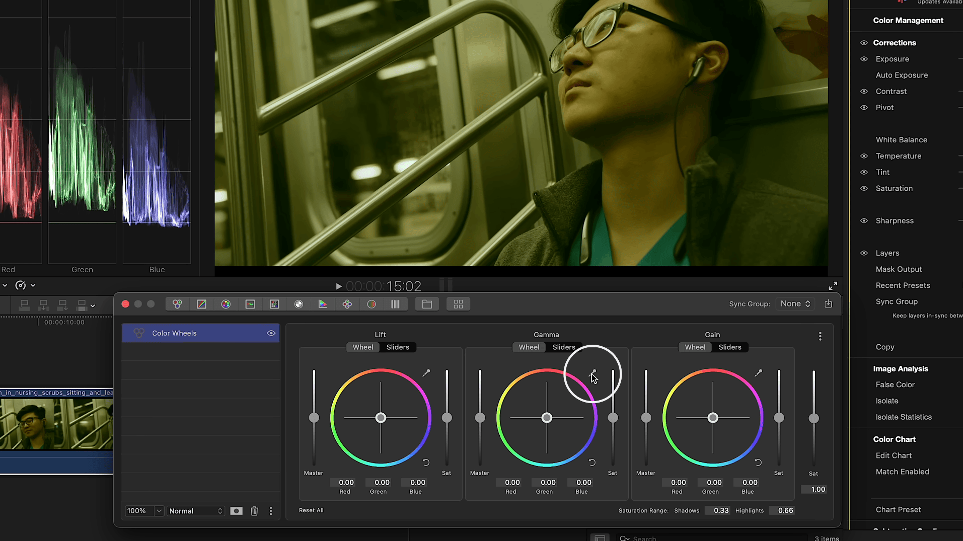 Essentially, it’s auto grading. For balancing highlights, click on something that should be the brightest neutral white. In this case, the lights in the back are a perfect choice. For midtones, choose something neutral gray—like the metallic element of the subway car. For shadows, pick an area that should be dark gray or something similar.