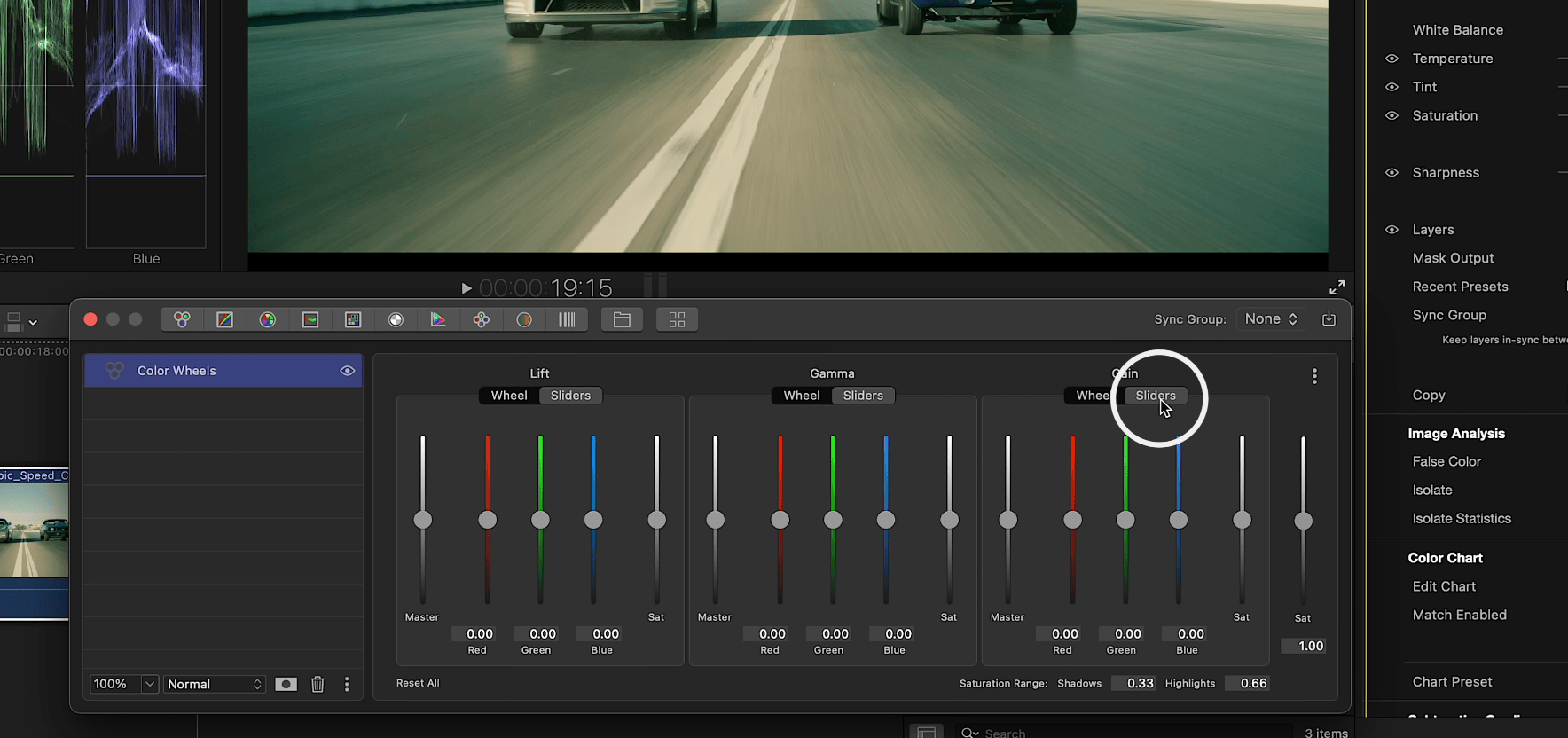 Here’s another example of using Color Wheels, but in a different, more advanced way. Switch the the wheels into their sliders mode by toggling the option above each wheel.